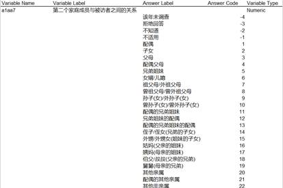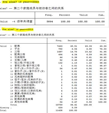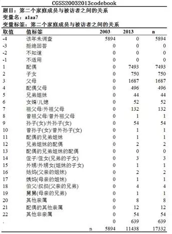 CGSS合并数据codebook的主体为类别变量在不同年份的频数分布。本文以CGSS20032013两年合并数据中变量a1aa7“第二个家庭成员与被访者之间的关系”为例,为大家介绍两种快速生成频数分布表的方法。该频数分布表的基本结构如下图所示: