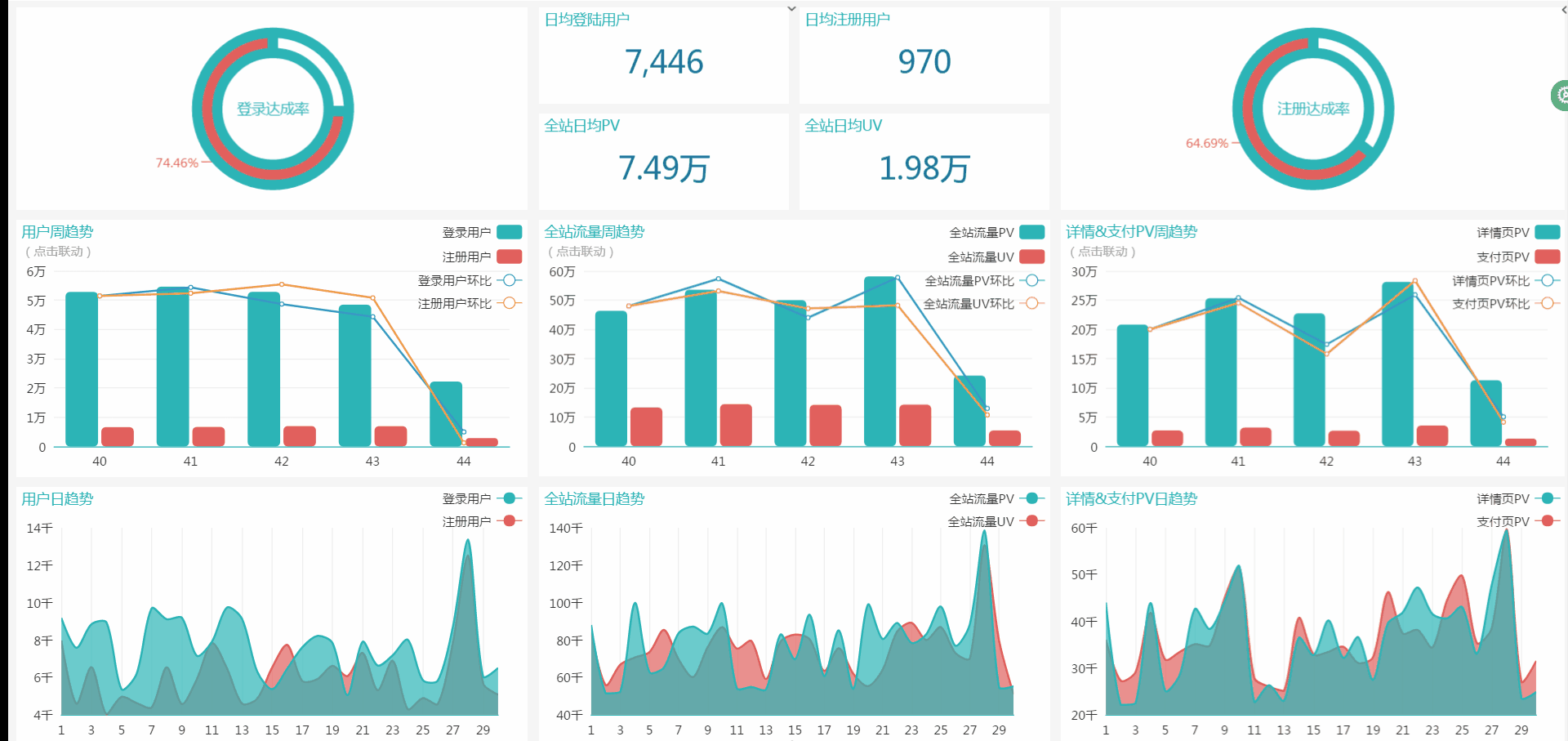 主要展示内容:电商运维BI解决方案中该报表以网站用户留存分析为主,分析指标包括日新增用户数量与对应多日留存率,通过联动功能可查看当月某日新增用户数量与其对应的多日留存率,方便查看该日新增用户的留存情况。