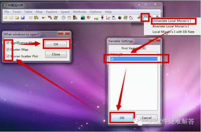第三步,绘制空间自相关地图,首先点击第二排倒数第三个小按钮,然后打开Univariate Local Moran's I(指单变量的空间自相关分析),在弹出框中点击需要进行空间分析的变量,然后OK,会再次弹出一个框,勾选三个框,这三个分别是“自相关显著性地图”,“聚类地图”,“莫兰散点图”,,然后点击OK即可。