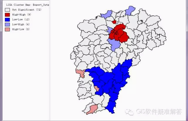 看一下小编的结果,江西省分县人均GDP自相关分析。可以明显的看出,江西省贫富分布状况,四小市和昌九地区较富裕,四大市则相对贫困,而赣东南和鄱阳湖东部则是经济最欠发达的地区。