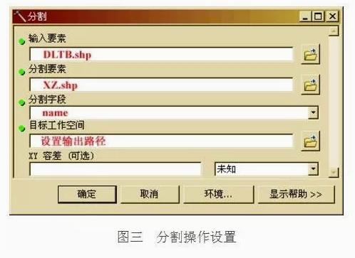 (2)双击分割工具,打开分割工具的操作对话框。比如说现在有两个数据,一个是某县土地利用现状图DLTB.shp,另一个是该县的乡镇行政区划图XZ.shp,乡镇图属性库中用字段name来对每个乡镇进行唯一标识,表示内容为乡镇名称。现在要做的是将每个乡镇的土地利用现状图裁减出来。设置如图三所示。
