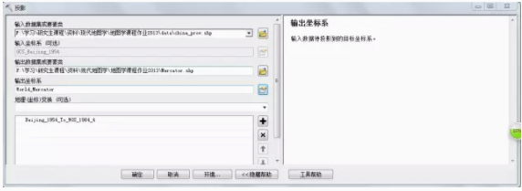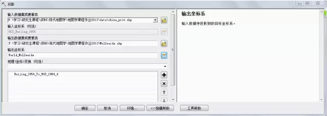 5、在投影界面,首先在输入数据集或要素类里选择要进行投影变换的数据,在输出数据集或要素类里选择输出路径及文件名,在输出坐标系里选择World_Mollweide,如图6,7。