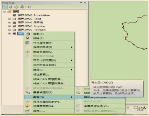 Cad文件在arcgis软件应用中起着的重要的作用,下面就cad文件”国界.dwg”转shape文件的一些方法及相关步骤加以叙述: