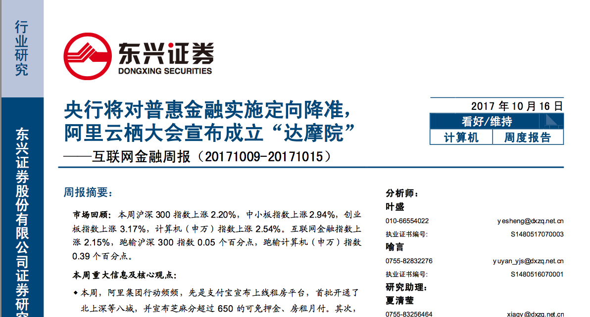 【行业研究】东兴证券互联网金融周报:央行将对普惠金融实施定向降准,阿里云栖大会宣布成立“达摩院”