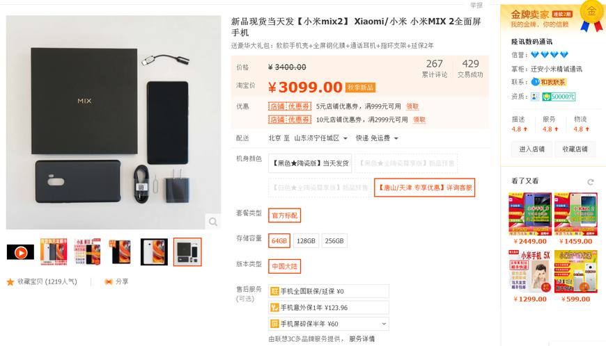 在淘宝平台第三方卖家那里,64G入门版的小米MIX比官方便宜了200块钱,如果再算上店铺的优惠,能够便宜210块钱。相比之下,而128G版比官方售价竟然低了300块,算上10元店铺优惠券,小米MIX2的第三方售价要比官方低310块钱。