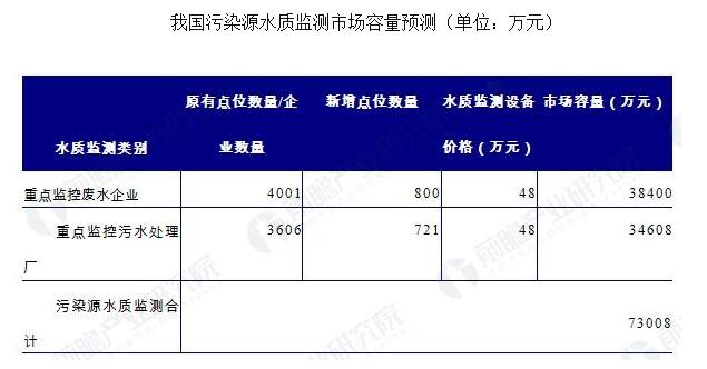 水质监测行业发展前景与投资机会分析报告》显示,2014年,我国重点监控废水企业有4001家,重点监控污水处理厂有3606家,水质监测设备按48万元的价格计算,我国污染源水质监测市场容量将达到7.30亿元。