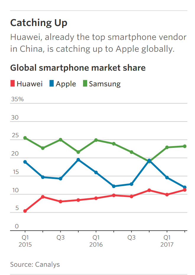 Huawei has had some success edging into the premium segment long dominated by Apple. The company shipped more than 6 million of its prior flagship, the P10, in the first half of the year. The average sales price of its phones has been rising, while phones costing more than 500 dollars are making up a bigger share of total sales, according to Canalys.