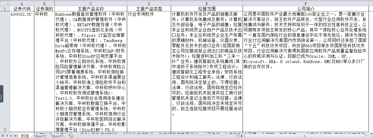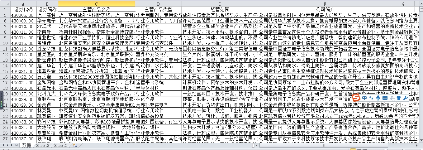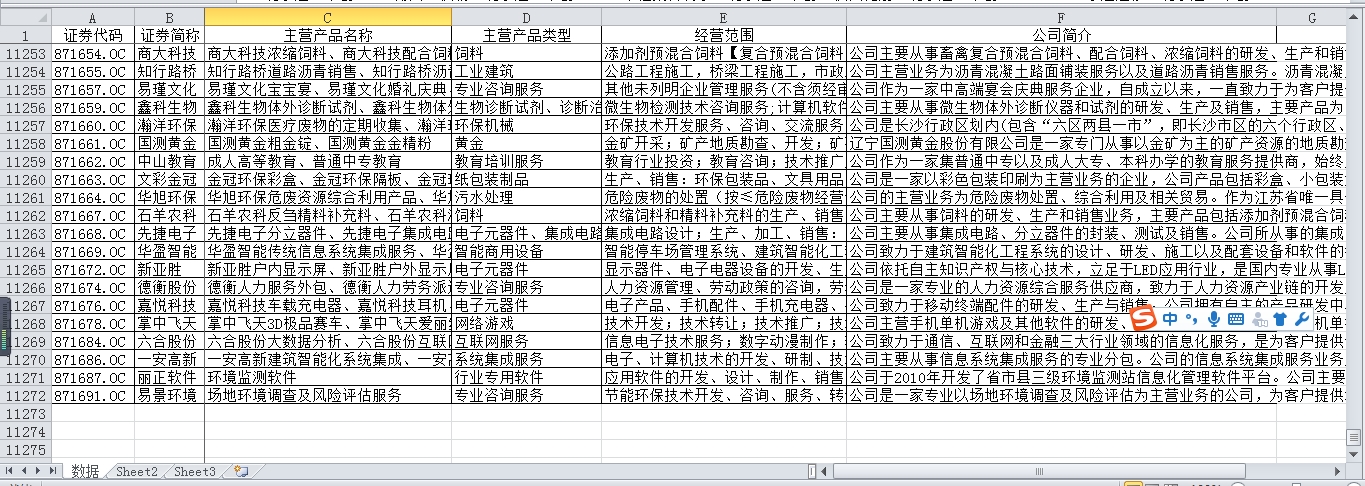 全部11271家新三板企业主营业务数据,包括主营产品类型、主营产品名称、经营范围、公司简介等信息。在excel文件中,可以通过搜索、筛选等功能,查找需要查找的新三板公司的相关信息。