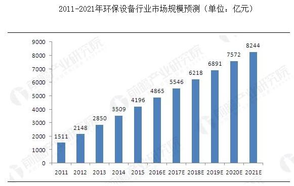 环保行业发展前景与投资预测分析报告》显示,在国家环保政策的大力支持及环保投资的日益增长下,环保产业日趋强大,市场前景广阔,2015年我国环保设备行业产值达到4000亿元,2021年我国环保设备行业产值将有望超过8200亿元。