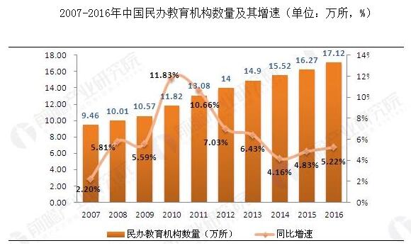 民办教育行业市场前瞻与投资战略规划分析报告》数据显示,2007-2016年,中国民办学校数量稳步增长,年均增速约为6.80%。2016年,全国共有各级各类民办学校17.12万所,比上年增加8253所;在校学生4825.47万人,比上年增加253.95万人。