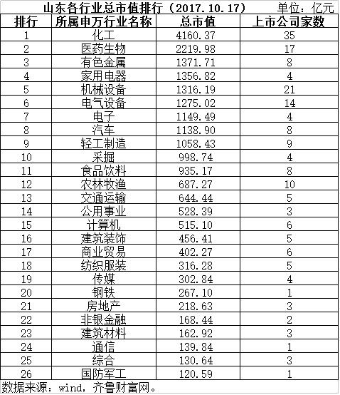 齐鲁财富网以wind数据为基础进行统计发现,截至10月17日,山东190家A股上市公司总市值总市值为22042亿元。按照申万一级行业来划分,山东涉及26个行业,上市公司数量来看,化工业以35家,位居第一位。按照市值来看,化工业达到4160.37亿元,仍然保持第一。总市值最少的则为国防军工,仅为120.59亿元,但同时也要考虑到该行业也仅有1家上市公司。而机械设备业虽然在上市公司家数上位居第二位,但是总市值来看,却被医药生物、有色金属以及家用电器超过,仅位居第五位。