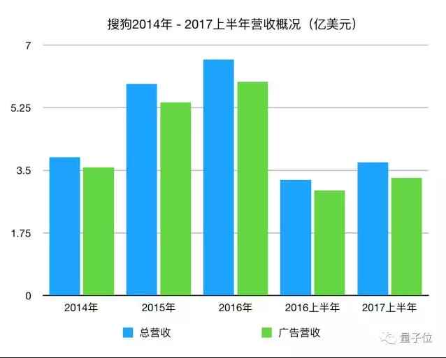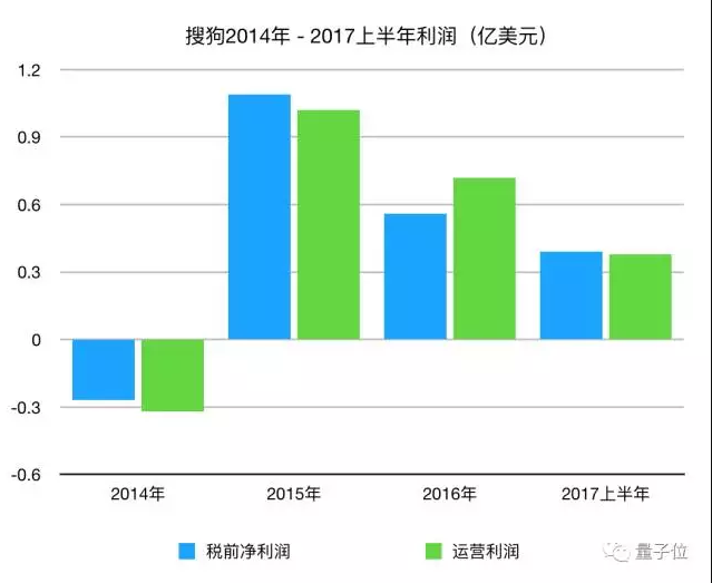 还是2014、2015和2016连续三年,搜狗的税前净利润分别为:-2680万美元(亏损1.7亿元)、1.09亿美元(7.18亿元),5610万美元(3.7亿元),2017年上半年则净入3880万美元(2.5亿元)。