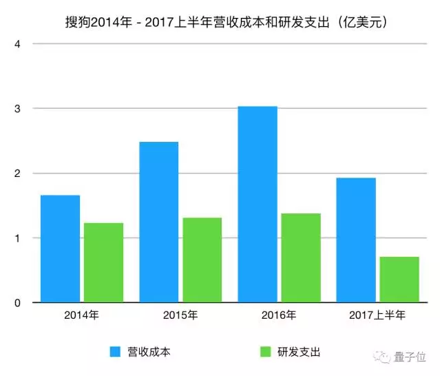 为实现上述营收,搜狗连续三年的营收成本情况为:2014年成本支出1.66亿美元(10.9亿元),2015年成本支出2.48亿美元(16.4亿元),2016年成本支出3.03亿(19.9亿元)美元,2017年上半年成本支出则为1.93亿美元(12.7亿元)。
