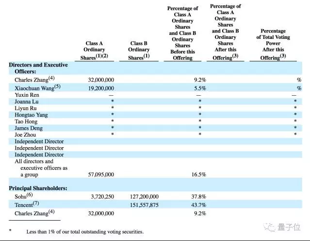 在搜狗上市前,所有董事会成员和高管总共持有A类普通股57,095,000股,持股比例16.5。其中,董事长张朝阳持有A类普通股32,000,000股,持股比例9.2%,CEO王小川持有A类普通股19,200,000股,持股比例5.5%。
