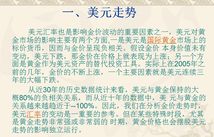 目前,黄金已经成为金融市场公认的避险资产,其走势也是起起伏伏,但长期来讲还是波动向上,决定黄金价格的因素都有哪些呢?附件ppt详细介绍了影响黄金价格的八大因素,例如美元走势等,可供大家参考使用资源链接: