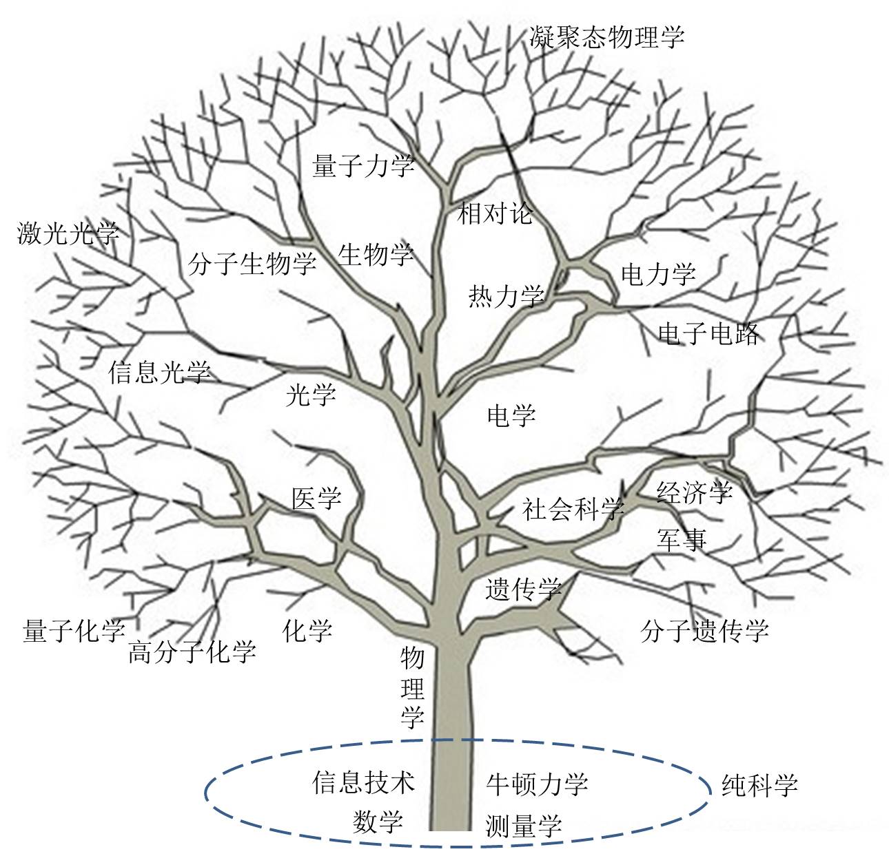 科学的树状模型示意图(只是示意),从主干不断生出越来越多的分支,主干为3大专业和1个理论