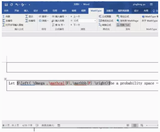 然后,你用鼠标轻点一下公式,然后再点击Mathtype的功能键“切换Tex”。于是你发现公式变成了一行代码,这行代码就是Latex的数学公式代码。