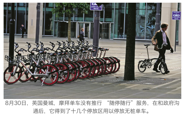 曼彻斯特的新市长AndyBurnham是其中一个支持者,他把共享单车计划称为“在英国未经测试的想法”。“作为市长,我很希望看到更多的人选择骑自行车而不是开车出行,但同时我也知道我们的城市中心是非常复杂的,并且已经相当繁忙,所以曼彻斯特交通部会和摩拜一起合作,确保这项服务能够有序推行,不妨碍他人出行,以及保证城市正常运作。”“曼彻斯特在共享单车方面的推进以前一直不太积极,主要是因为有桩车的造价太贵。但是曼彻斯特在引入摩拜的时候也是相当谨慎的,因为我们也看到它们在中国遇到的一些问题。如何有序地回收自行车,这些都是需要在实践中慢慢摸索的。”曼彻斯特中国论坛执行总监RhysWhalley对《第一财经周刊》说,该论坛是摩拜在曼彻斯特最早的推荐人。