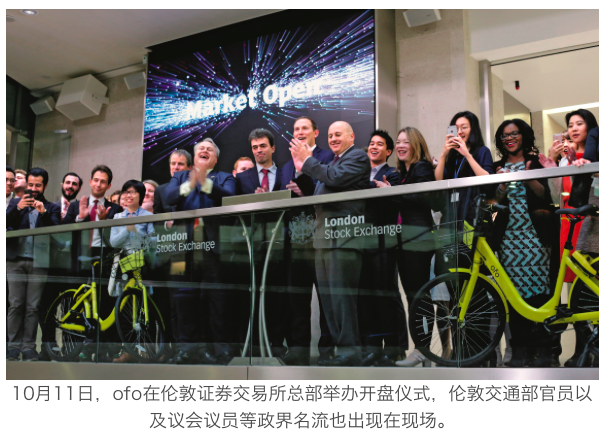 10月11日,ofo在伦敦证券交易所总部举办开盘仪式,伦敦交通部官员以及议会议员等政界名流也出现在现场。