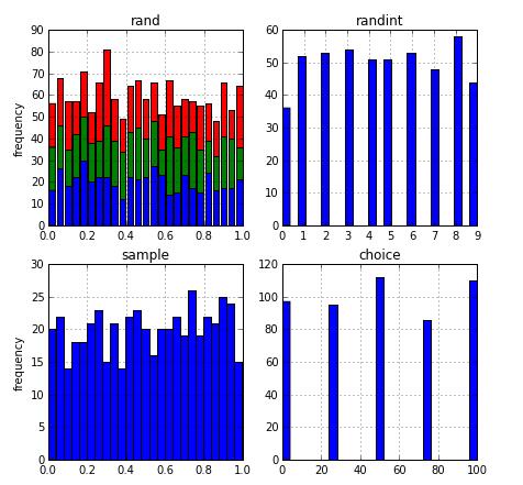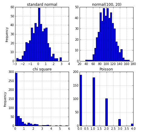 用 Numpy 生成不同分布的伪随机数,主要包括均匀分布、正太分布、直方分布和泊松分布。