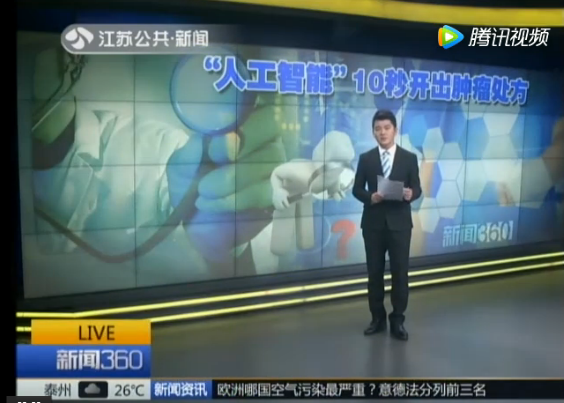 下面这段视频显示的就是,“人工智能医生”江苏“首诊” ,机器人“沃森”10秒开出肿瘤治疗的案例。