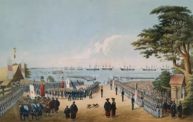 佩里将军随行画家Wilhelm Heine的作品,描述佩里登录横滨港的情形