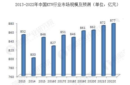 KTV行业竞争格局与投资战略研究咨询报告》预计,今年,KTV行业市场规模达到851亿元左右,随后缓慢增长,到2022年市场规模有望增至877亿元,市场前景不甚乐观。