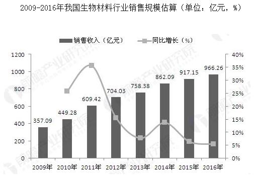 生物材料行业市场前瞻与投资战略规划分析报告》显示,到2016年,我国生物材料行业产值约为955.74亿元。