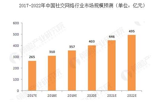 按照当前社交网络在中国的发展趋势,预计到2017-2022年,我国社交网络的增长速度将不低于10%,2017年底有望达到265亿元,而到2022年将我国社交网络行业的市场规模将接近500亿元,达到495亿元。