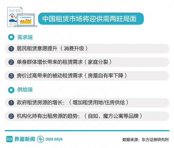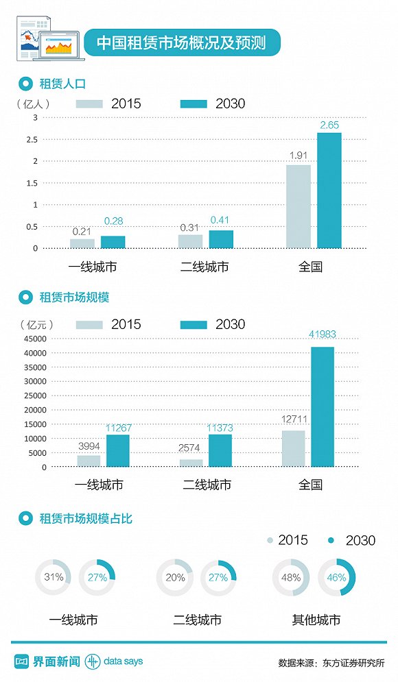 东方证券认为,在居民租赁意愿提升、单身群体增长、政府租赁房源增加等因素的影响下,中国租赁市场将迎来供需两旺的局面。到2030年,中国租赁人口有望达到2.7亿人,对应市场规模将达4.2万亿。