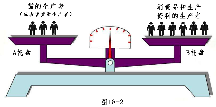 上图18-2中A托盘中的生产者人数代表的是货币的产出数量,B托盘中的生产者人数代表的是消费品和生产资料的产出数量。两个托盘中间的指针代表了各个盘上生产者的利润,指针偏向哪一方,那一方的利润就低。
