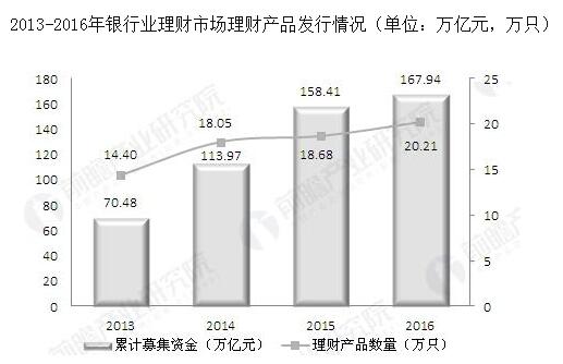 银行理财产品行业运营模式与投资战略规划分析报告》显示,2016年,银行业理财市场有523家银行业金融机构发行了理财产品,共发行20.21万只,平均每月新发行产品1.68万只,累计募集资金167.94万亿元,比上一年分别提高8.17%和6.01%。