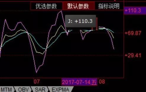 图中可以发现,当KDJ指标中的J线,也就是这条紫色的线条,它代表股票的上涨空间以及乖离率的偏离程度。