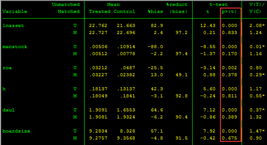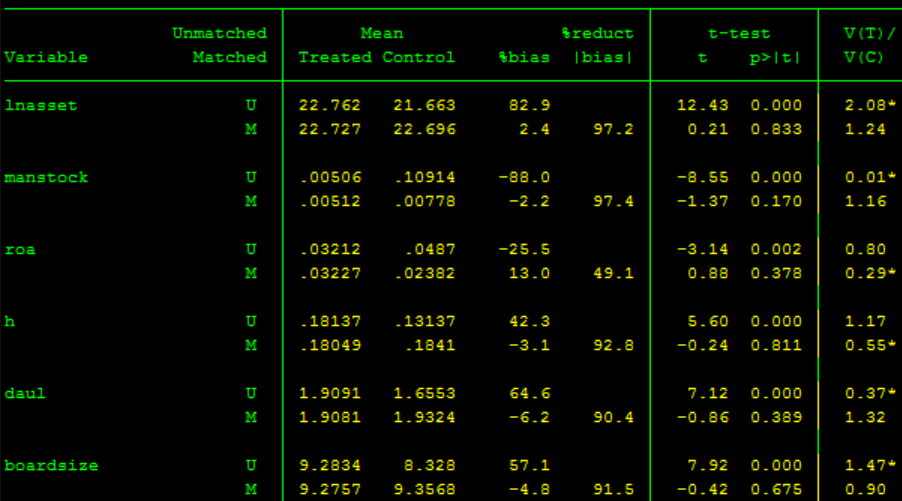 1、看不太懂步骤4、步骤6平衡性检验的结果,请以步骤6结果为例解释下(我目前只认定从U到M,P值由显著变为不显著即该变量通过平衡性检验)