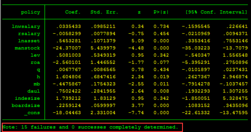 步骤3、psmatch2 policy lnwsalary rsalary lnasset manstock lev roa q h mb daul indesize boardsize, neighbor(2) common caliper(.03) //对所有控制变量都进行倾向性匹配得分,选出显著的变量在步骤5中再做一遍