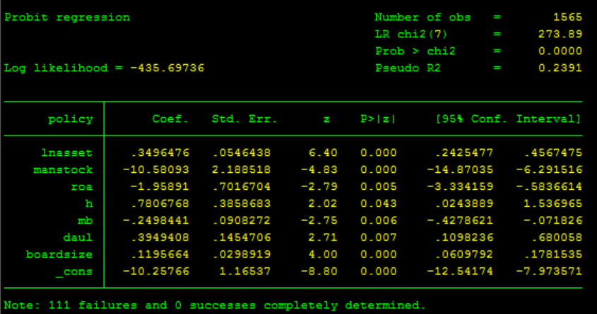 步骤5、psmatch2 policy lnasset manstock roa h daul boardsize, neighbor(2) common caliper(.03) //用步骤3中显著的变量来做倾向性匹配