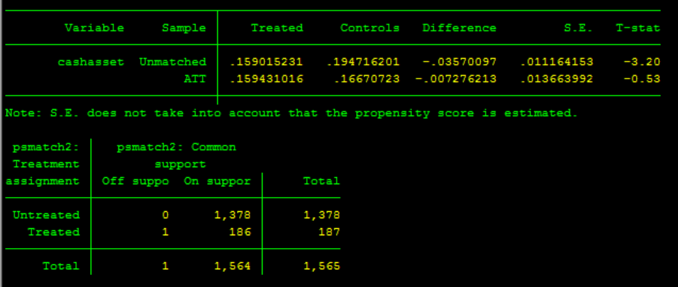 步骤7、psmatch2 policy lnasset manstock roa h mb daul boardsize, outcome(cashasset) neighbor(2) common caliper(.03)