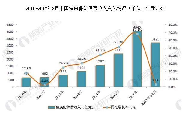 健康保险行业市场前瞻与投资战略规划分析报告》显示,我国健康险保费收入基本呈整体上升趋势,2015年,中国健康险业务原保险保费收入达到了2410亿元,相比上年增长了51.86%。2016年健康险业务原保险保费收入4042.50亿元,同比增长67.71%。2017年1-8月,中国健康险业务原保险保费收入达到了3194.93亿元,同比增长3.12%。