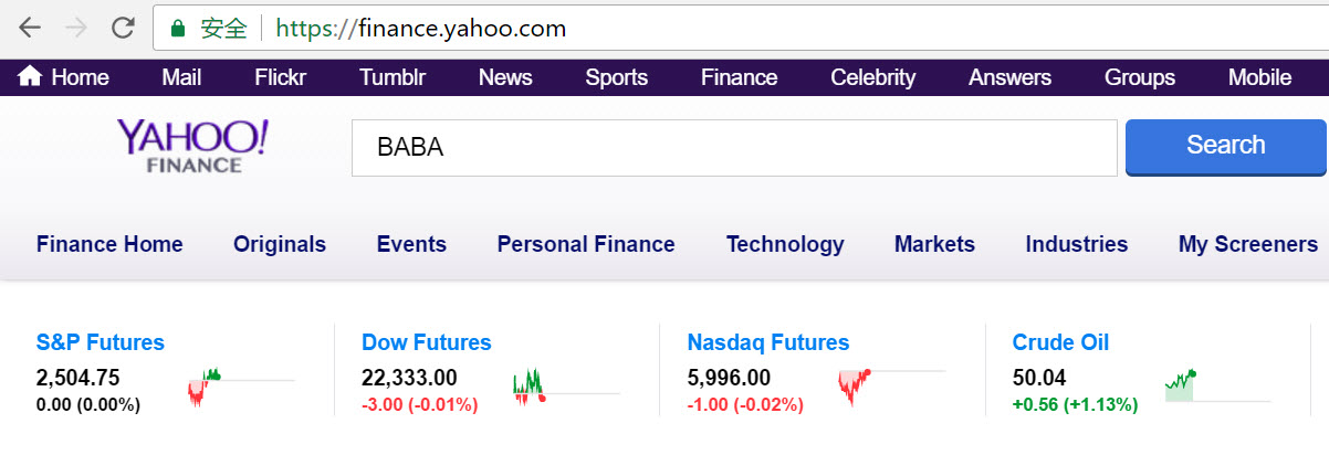 以阿里巴巴股票价格做一个简单的展示。我们首先打开雅虎财经的网站(https://finance.yahoo.com),阿里巴巴的股票代码为BABA,我们在搜索框中输入BABA,下面会提示出对应的公司,我们可以直接从提示中选择Alibaba公司,也可以直接点击右侧的Search进行搜索。