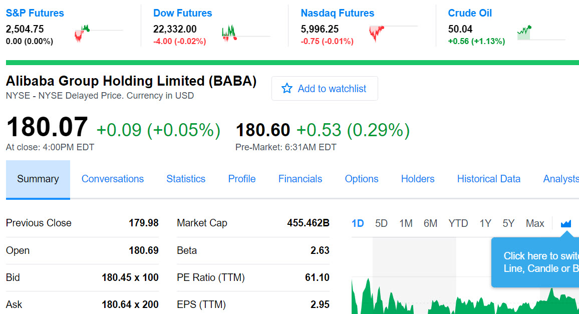 当我们点击搜索之后,页面直接跳转到与阿里巴巴公司股票相关的页面。我们会发现有阿里巴巴公司当前的股票价格,涨跌比例,以及其他的交易数据。当前页面显示的是Summary分页下的一些基本情况,我们需要的是阿里巴巴公司的历史交易数据,这个数据我们可以从Historical Data分页中找到,我们点击Historical Data分页。