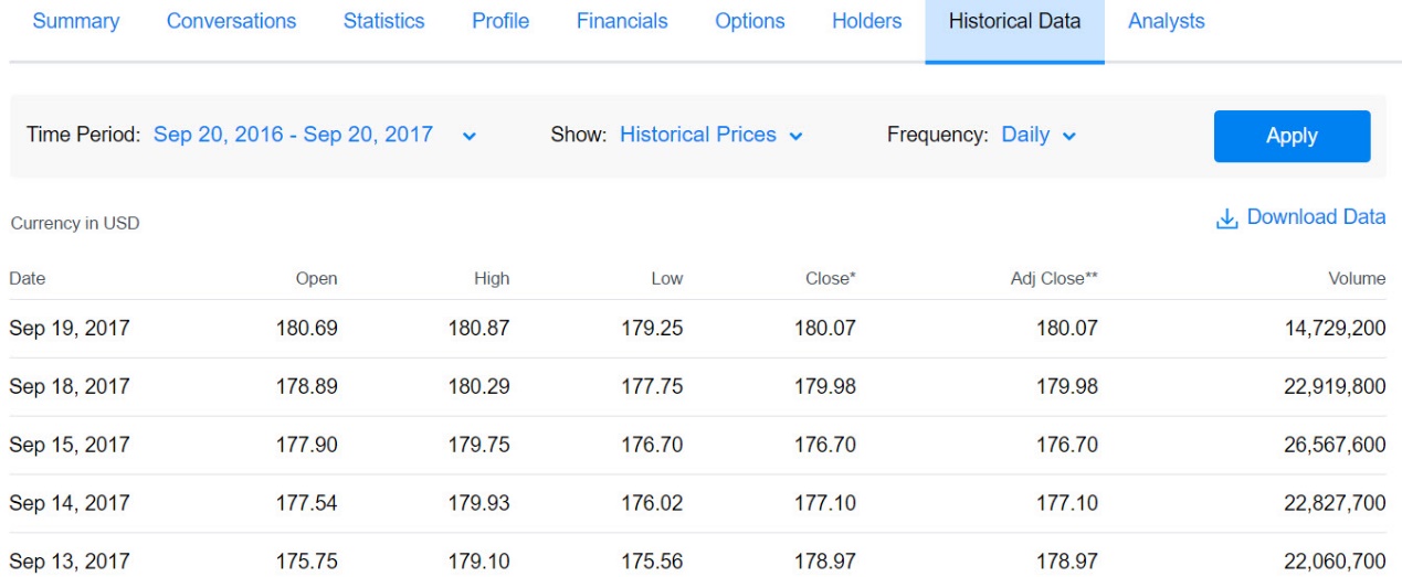 当我们点开Historical Data分页之后,我们会立即得到最近一年的股票交易数据,我们从Time Period选项可以看出,默认选项是最近一年,由于当前日期为2017年9月20日,所以起始日期默认为2016年9月20日,这个我们可以自行设置。Show选项默认为Historical Prices,即历史价格数据,这个正好是我们需要的。Frequency选项默认为Daily,即每天的交易数据。需要注意的是,我们将这些选项设置完成之后,一定要点击Apply按钮,即应用按钮,否则我们设置的选项并没有作用,点击完Apply按钮之后,我们直接点击Download Data进行下载。