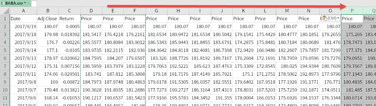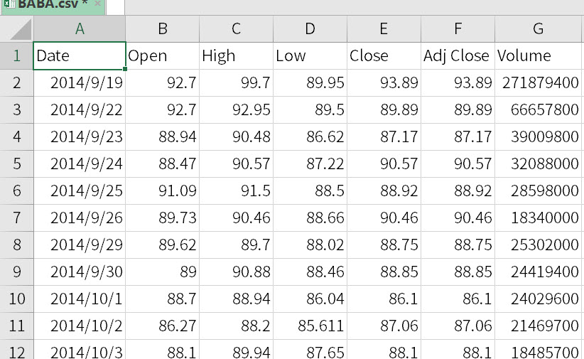 我们发现下载的文件为BABA.csv,我们打开该文件之后发现共有7列数据,分别是Date日期,Open开盘价,High最高价,Low最低价,Close收盘价,Adj Close调整后的收盘价,Volume成交量。在这里,我们只需要使用Adj Close这一列,Adj Close与Close的不同之处在于,Adj Close考虑了股票拆股、发放股利等情况,将其调整为正常的收盘价,而Close只是显示当时实际的价格,而不考虑股票拆分和发放股利等情况。
