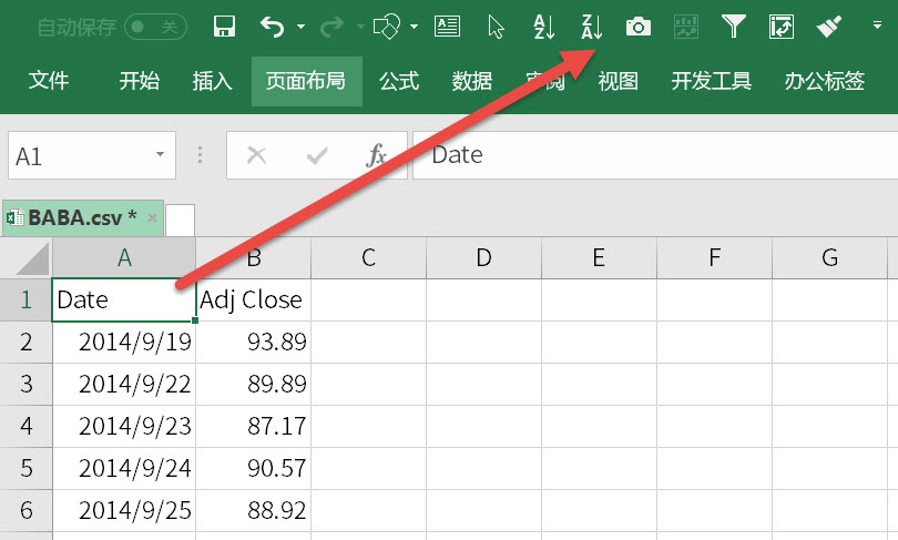 删除不必要的数据之后,我们点击Date,然后对数据进行倒序排序,我们可以从数据选项卡下的排序找到,也可以将常用的排序工具添加到自定义功能区中直接使用。