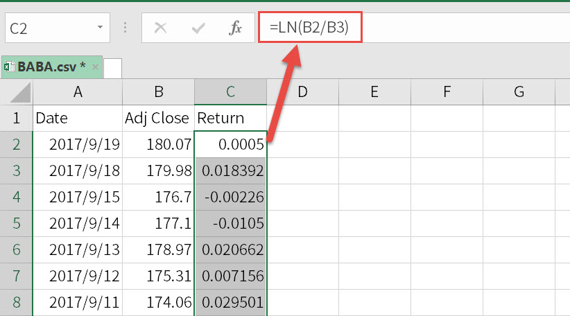 我们在得到了倒序的数据之后,在C1单元格添加一个Return的列,通常情况下,我们计算的是对数收益率,而不是简单的算数收益率。我们在C2单元格中输入公式=LN(B2/B3),然后我们得到了一个收益率的数据,我们双击该单元格的右下角来完成自动填充,从而获得整个收益率的分布。