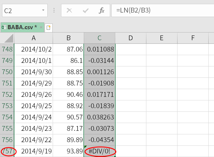 需要注意的是,我们计算的Return数据中有一个缺失值,这是因为最后一个值无法计算,所以我们会得到一个#DIV/0!的结果。除此之外,我们还可以发现一共存在757个数据行,但是第一行为列标题,最后一行存在缺失值,所以我们得到真正有用的是755行数据。