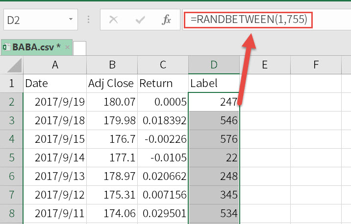 我们得到了股票价格每天随机变化服从的分布,但是如何从这个分布中抽取一个随机收益率呢?这个时候我们需要为分布中的收益率设定一个标签,我们先在D1单元格输入列标题Label,然后在D2单元格中输入公式=RANDBETWEEN(1,755),我们得到了一个随机标签,我们同样双击D1单元格右下角实现自动填充,从而获得所有的随机标签。