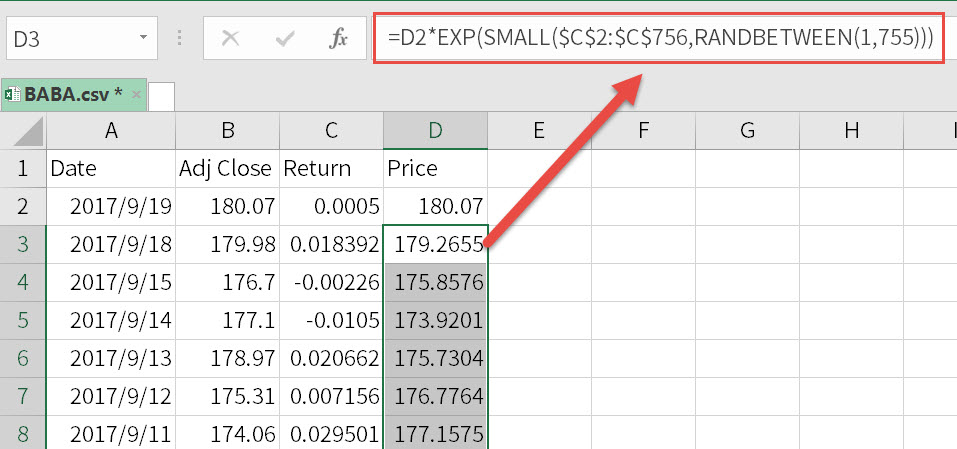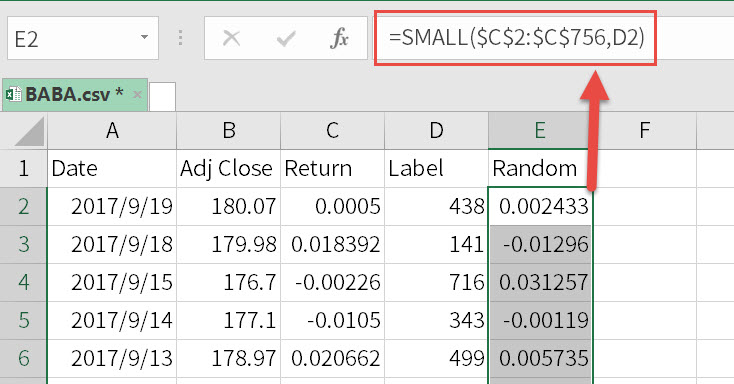有了相应的标签之后,我们可以从Return的分布中随机提取每天的股票价格变化了,我们在E1单元格中输入列标题Random,然后在E2单元格中输入公式 =SMALL($C$2:$C$756,D2),这个公式是从所有的Return分布中提取D2标签对应排序的数值。得出结果后,我们双击E2单元格右下角实现自动填充,从而得到所有的随机变化结果。