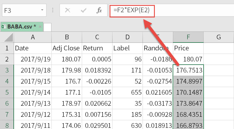 得到了上述的结果之后,我们就可以来预期未来的价格了。我们在F1单元格输入列标签Price,在F2单元格我们需要锁定起始价格,输入公式=$B$2,然后在F3单元格输入公式=F2*EXP(E2),然后双击F2单元格右下角实现自动填充。由于之前我们求的是对数收益率,所以我们在这里需要使用EXP()函数进行相应的转化。就这样我们模拟了一条股价未来可能的走势。