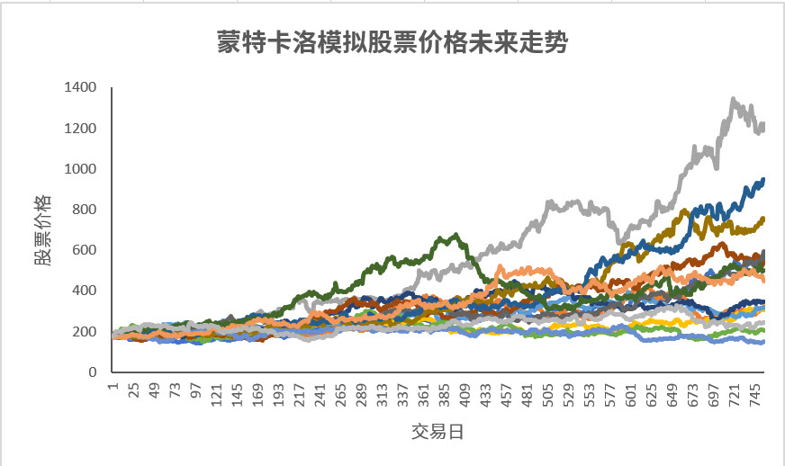 最后就是简单的图表修饰工作了,我们删除图例,删除网格线,然后添加坐标轴标题,横坐标轴为交易日,纵坐标轴为股票价格,图表标题为蒙特卡洛模拟股票价格未来走势,然后将横纵坐标轴边框设置为深色,适当地调整一下纵坐标轴的范围。最终呈现结果如下: