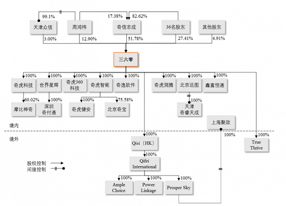 拆分上市首先令投资者注意的是重组标的三六零股份有限公司(下称三六零)的股权架构。众所周知,Qihoo 360与其他回归A股的海外上市公司一样,需要先经过私有化,然后再拆除VIE结构,最后将各个业务条线重新进行整合并估值。